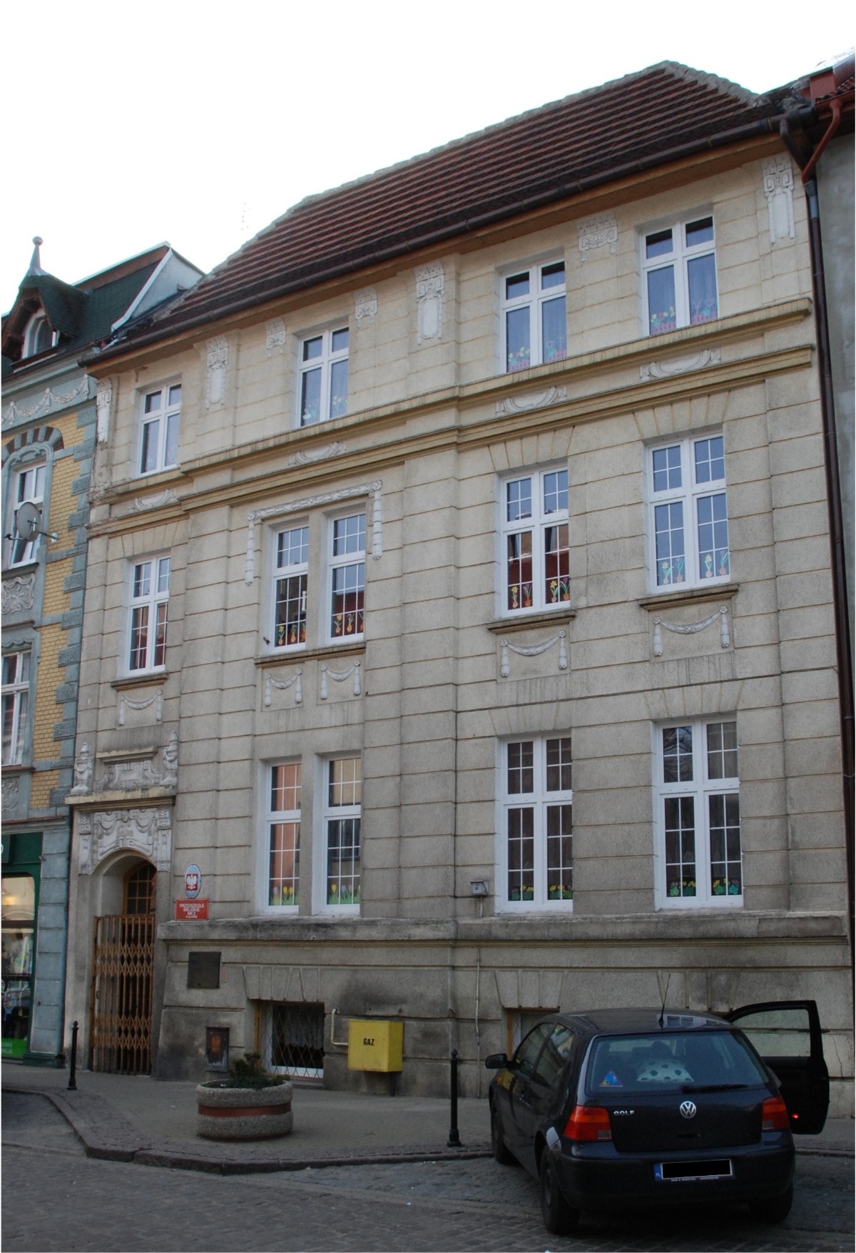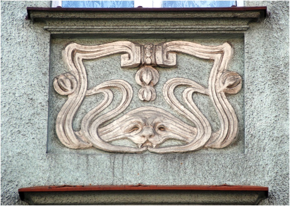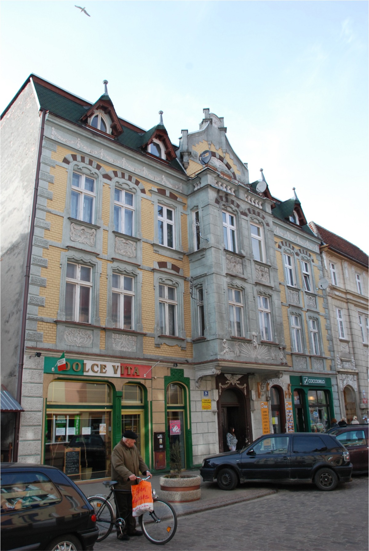 W zabudowie pierzejowej ulicy Jedności Narodowej szczególnie bogatym wystrojem fasady wyróżnia się kamienica handlowo – mieszkalna nr 24, o zwartej bryle, nakrytej asymetrycznym dachem dwuspadowym, z facjatkami w połaci frontowej. Oś środkowa elewacji frontowej zaakcentowana jest dwukondygnacyjnym wykuszem zwieńczonym szczytem sterczynowym. Zastosowany detal architektoniczny łączy cechy stylu późnego gotyku i klasycyzmu z elementami dekoracji secesyjnej (ornament roślinny o płynnej linii, maszkarony – jako wypełnienie płycin podokiennych, tynkarskie dekoracje emblematyczne). Do wnętrza prowadzą metalowe, masywne drzwi bramne, imitujące tradycyjne podziały stolarskiej konstrukcji ramowo – płycinowej.